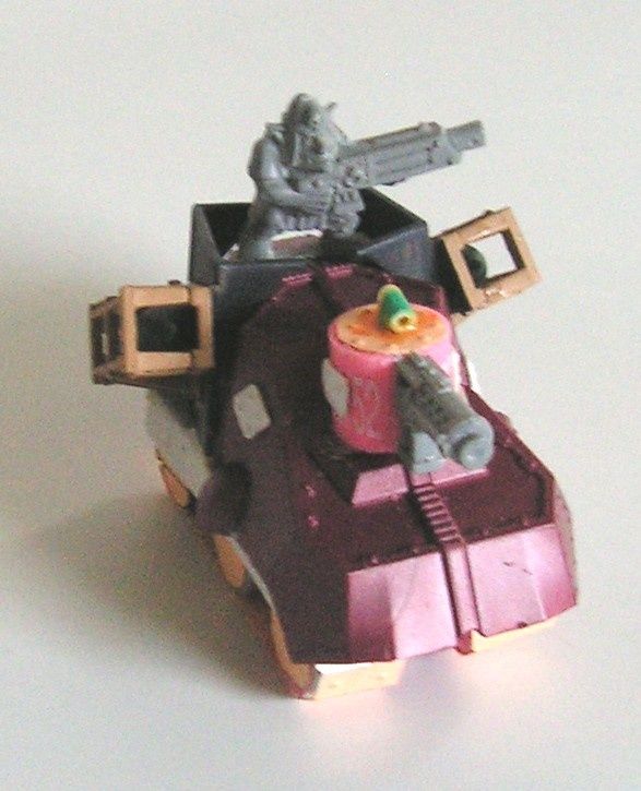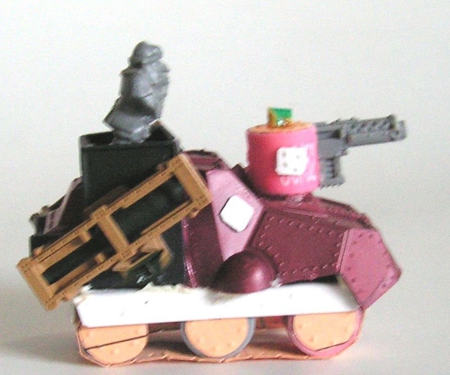 Pour compléter cette force, Il fallait un Tank de “Kommanda”. Un tank de de commandement comme le spécifie la fiche groupe blindé gretchin du livre Forge World « Imperial Armour Apocalypse Second Edition 2011 ». Pour le figurer, quoi de plus simple que de montrer l’individu (le Kommanda) sur son char. Une vielle figurine de grot de la V2 ferait parfaitement l’affaire. Ce qui caractérise un Tank de Kommanda, c’est qu’il puisse avoir deux armes lourdes.