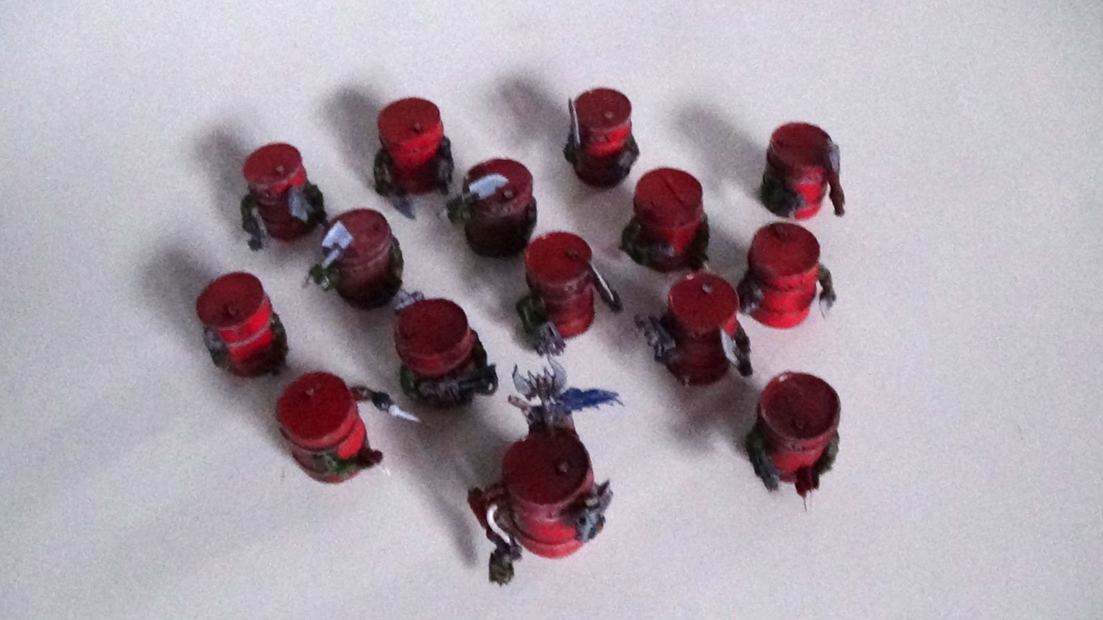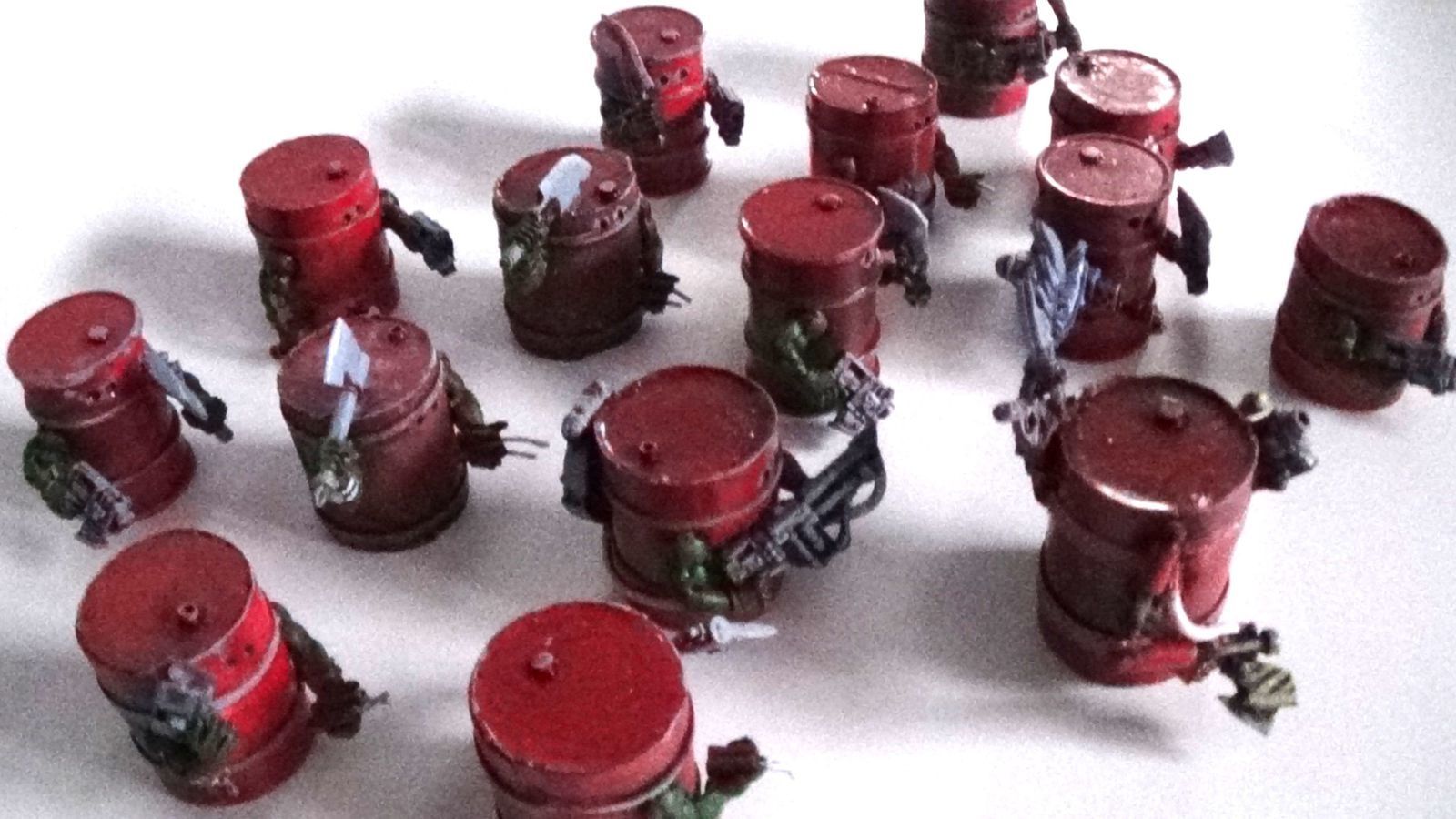 Voici les kommando orks enfin peints. L'escouade de 15 est complète avec 2 krameurs et un Nob avec une pince énergétique. La peinture est simple, sous couche noir, puis rouge. Puis à-plats de divers couleurs. En quelques coups de pinceau, c'est prèt.