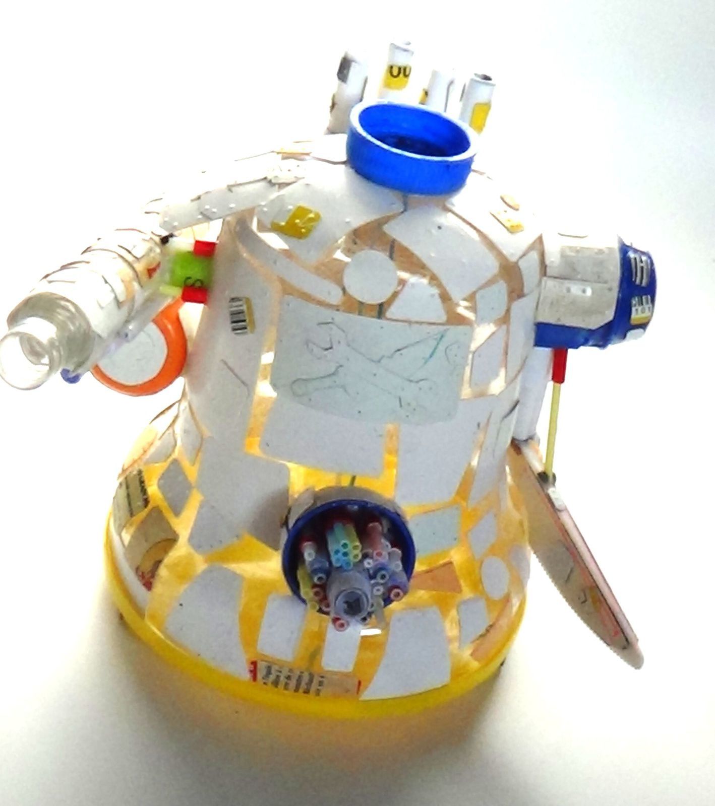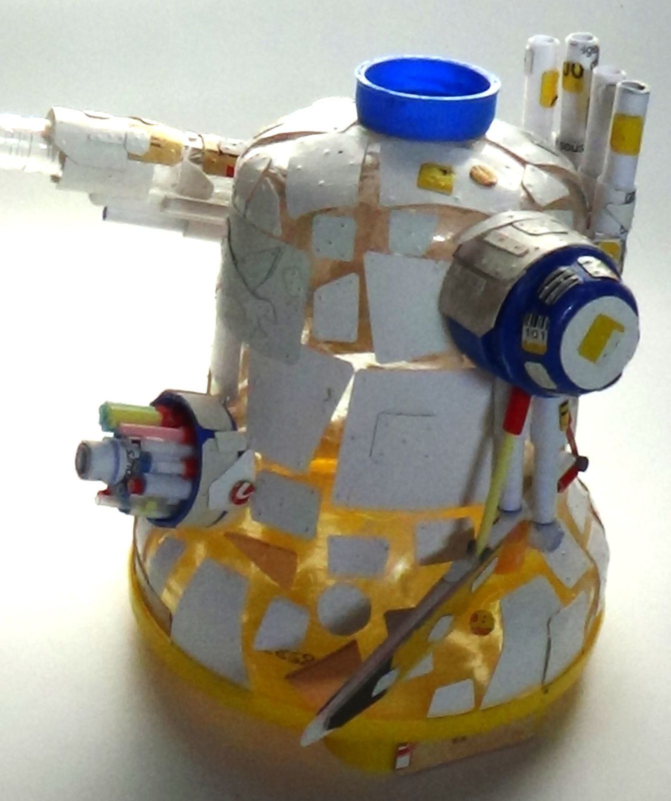 C'est l'assemblage final… ou presque ! Les armements primaires sont fixés. Seul l'arsenal de la mort ne l'est pas… pas plus que la tête initialement prévue. Le blindage est finit. Des trappes arrières sont réalisées et collées. Les pots d'échappement du système de propulsion sont réalisées en papier roulé. Ils sont collés au dessus des trappes. Pour fixer la tête, un bouchon est collé sur le haut du stompa. Le projet avance bien… mais je ne sais pas comment l'achever !