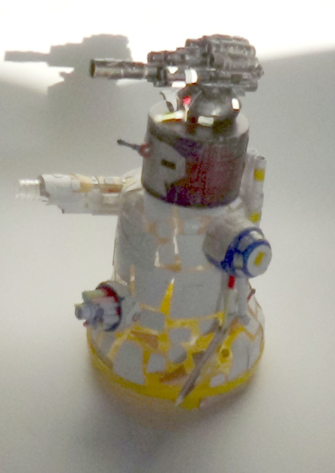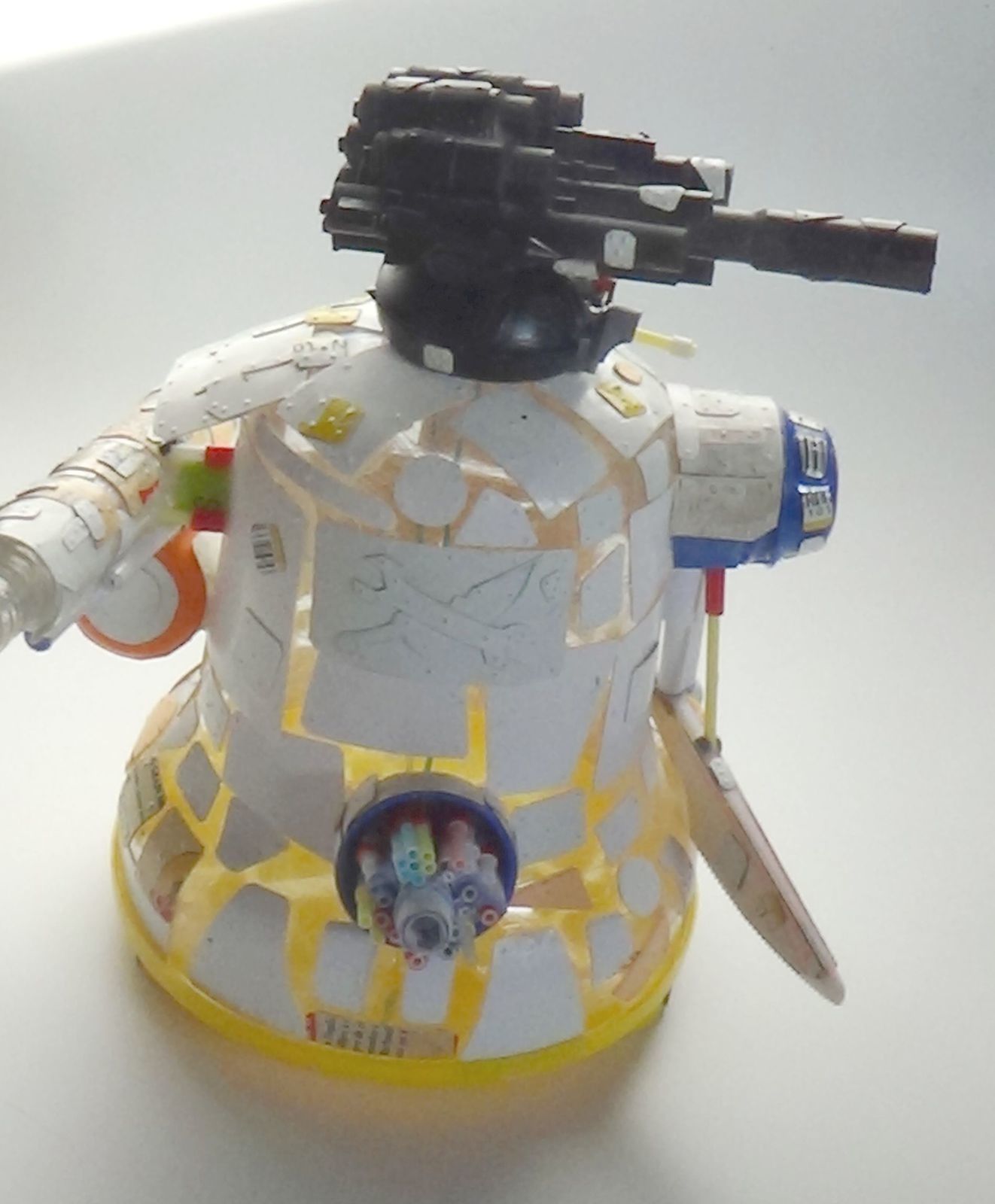 Je suis dans les temps… mais pas mes partenaires de jeu ! La partie doit être repoussée ! Un peu dépité, je passe le stompa à la sous-couche. Il y a un point positif dans cette histoire. Le bouchon collé sur le corps du stompa, s'insère parfaitement dans l'arsenal de la mort. Il fait un parfait pivot. J'ai donc une tête, et un arsenal de la mort, mobile. C'est pas mal, non ?