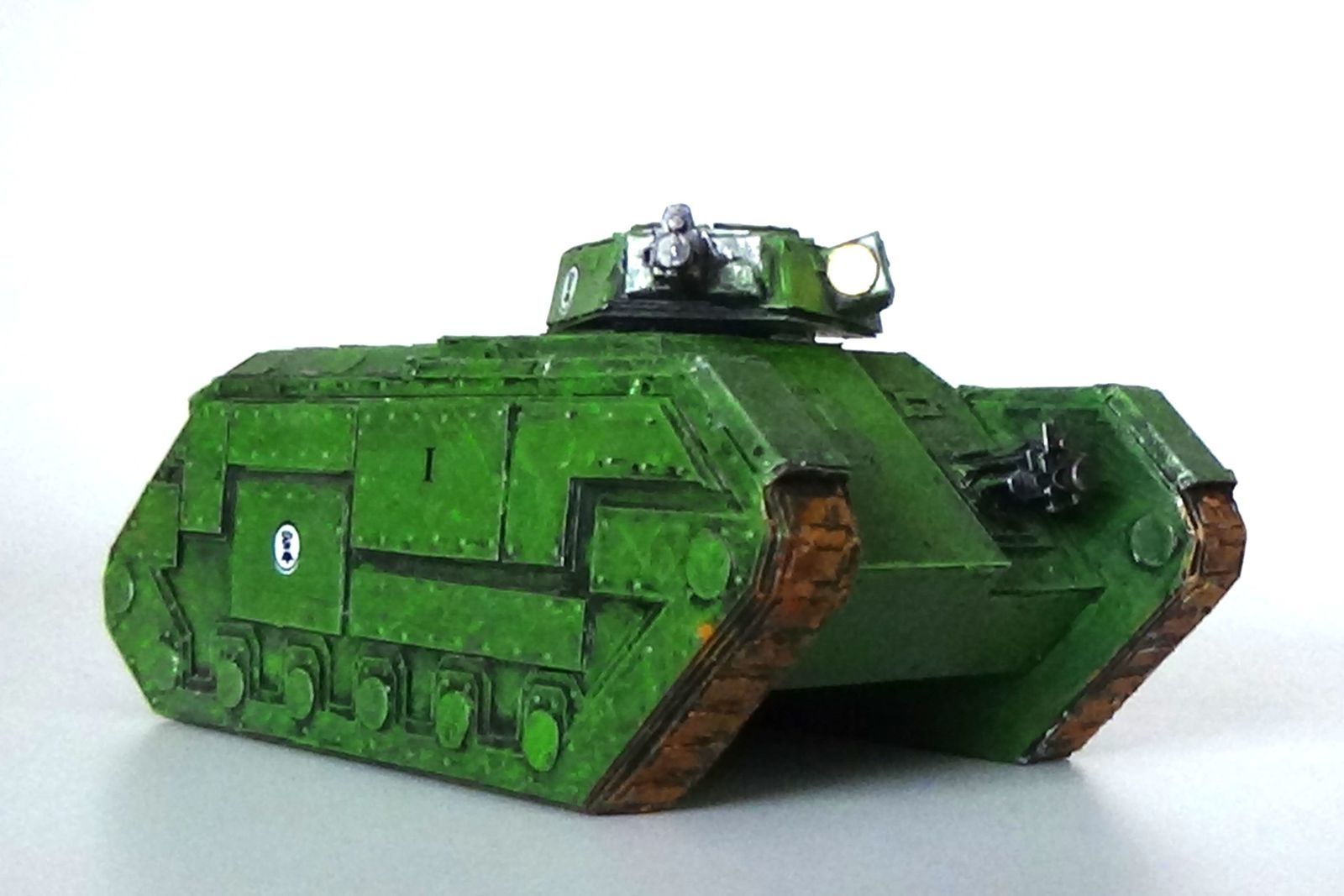 Le modèle de base est une chimère du russe Pataroch, que j'ai un peu modifié. Pataroch est la référence actuelle en terme de maquette en carton pour W40K. L'armement provient de rabiots divers.