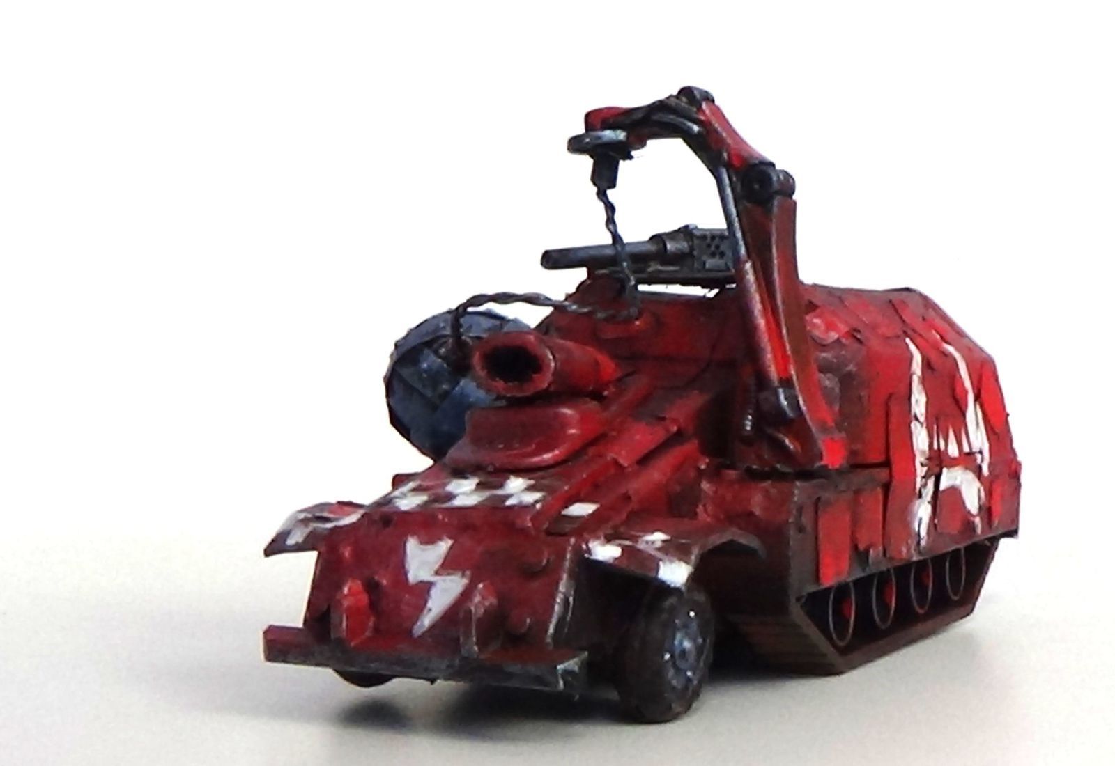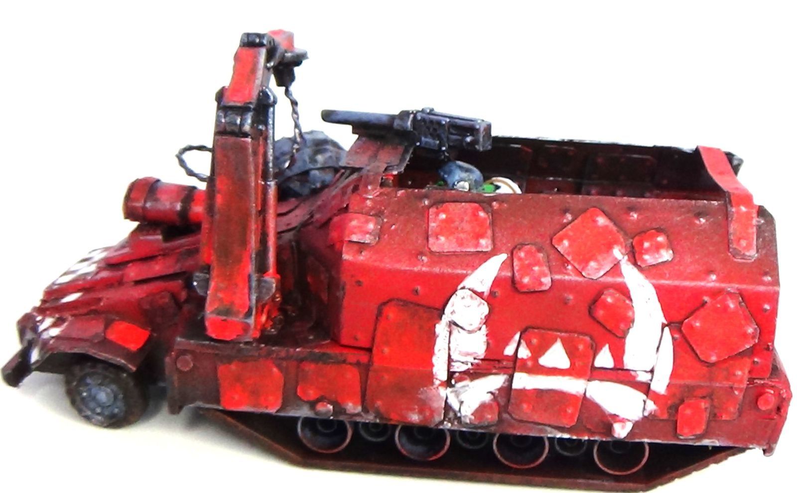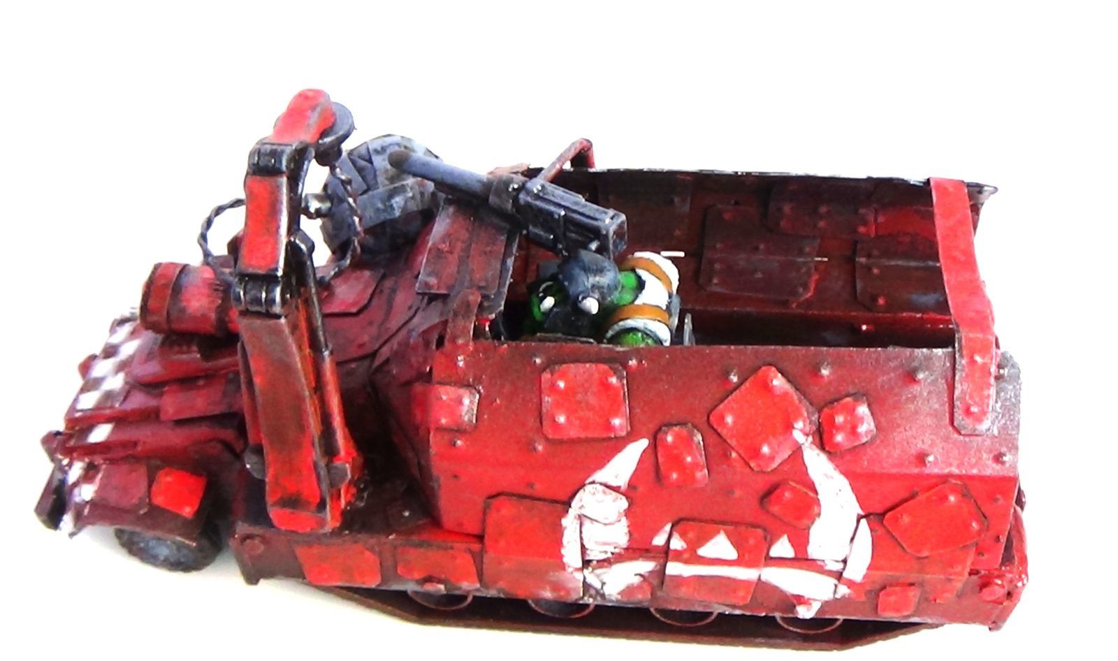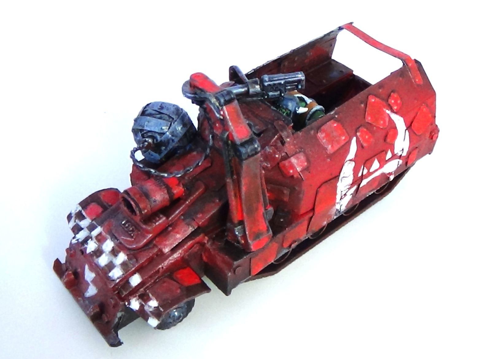 Avec la nouvelle version de Warhammer 40 000, les transports de troupe sont indispensables pour les « petites » unités d’infanterie. Surtout si elles choisissent de sortir de la protection offerte par les couverts. Il faudra que je convertisse d’autres trukk pour mes Elites. Les Chariots de guerre sont de superbes plateformes de tir… mais ils coûtent très cher en termes de point. Trop même surtout comparé au très efficace Trukk.