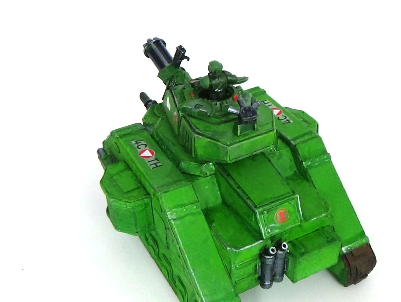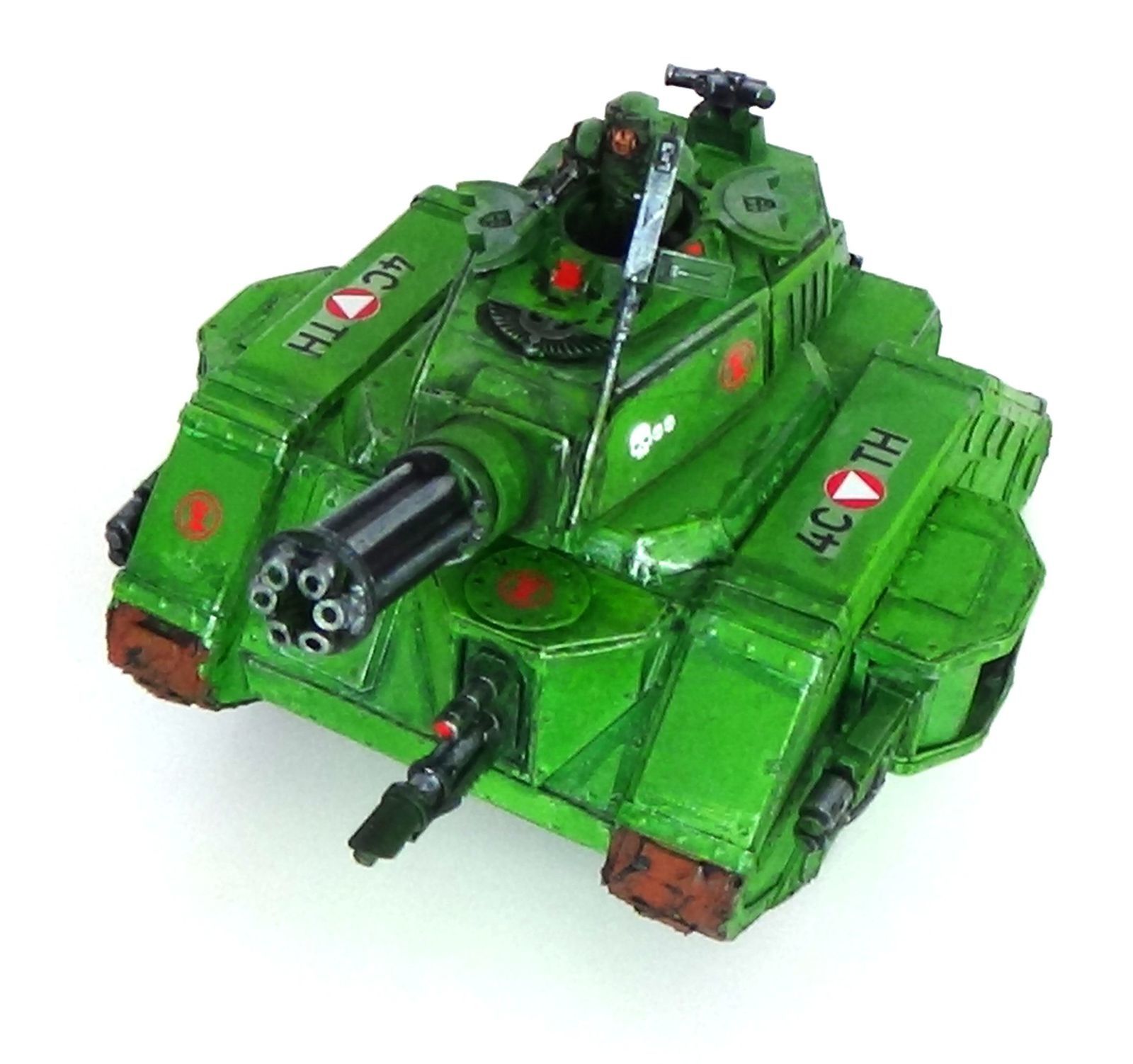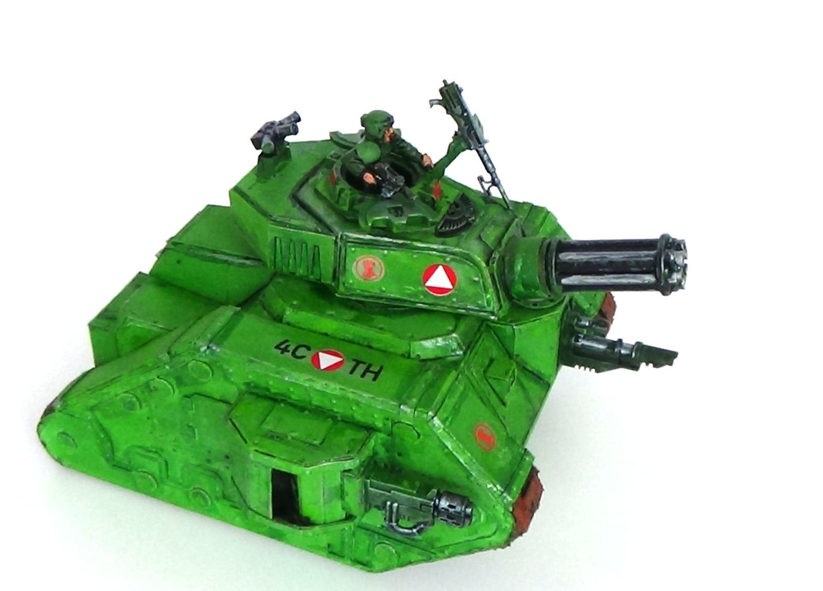 La maquette est basé sur le dernier modèle de Leman Russ. Par nostalgie, j’ai toujours produit le modèle originel de Leman Russ, celui des années 1990. De ce fait, les jeunes joueurs sont souvent surpris par mes figurines. Mais étant donné qu’il s’agit de Pask, j’ai pris le dernier modèle de maquette en carton (Pataroch encore une fois) et j’ai monté le tout. Les armes secondaires sont des vraies. Enfin les modèles Games Workshop. Il s’agit de Pask quand même, non ? Le Gatling provient d’un vieux jeux qui n’a jamais servit.
