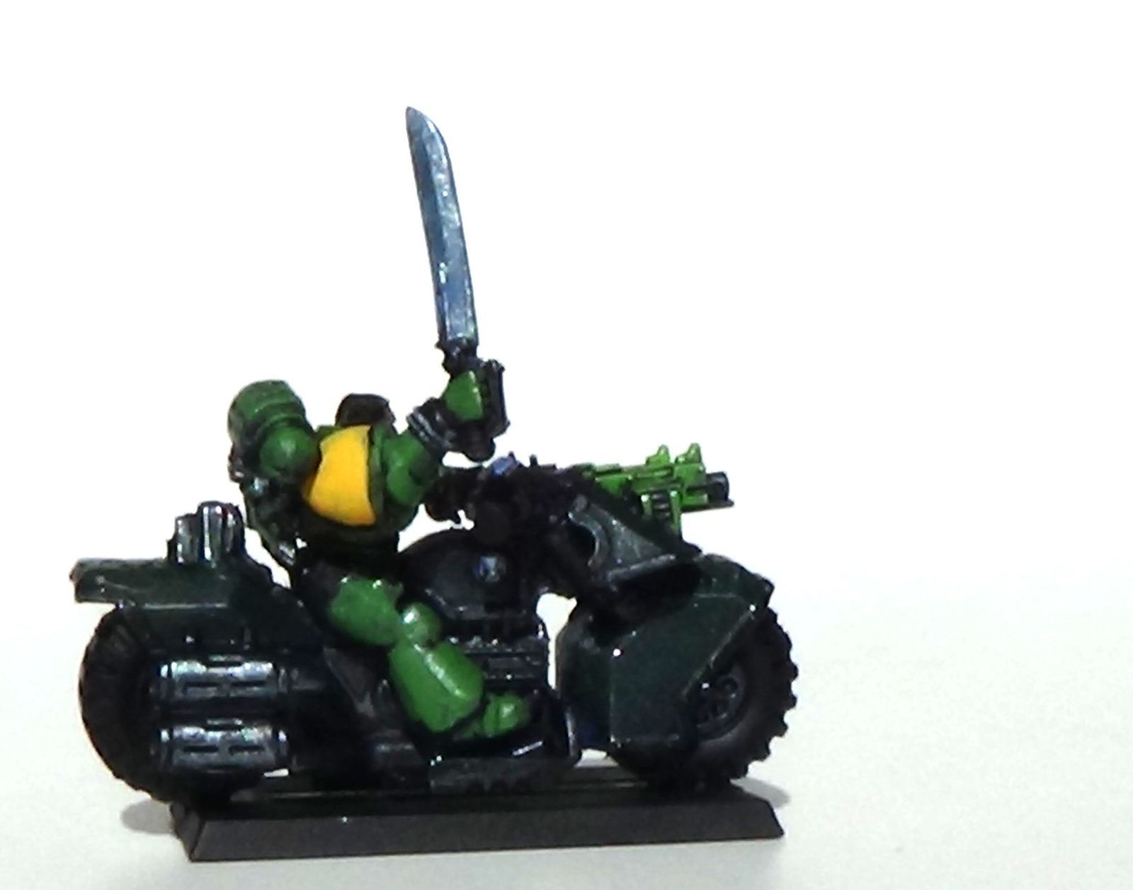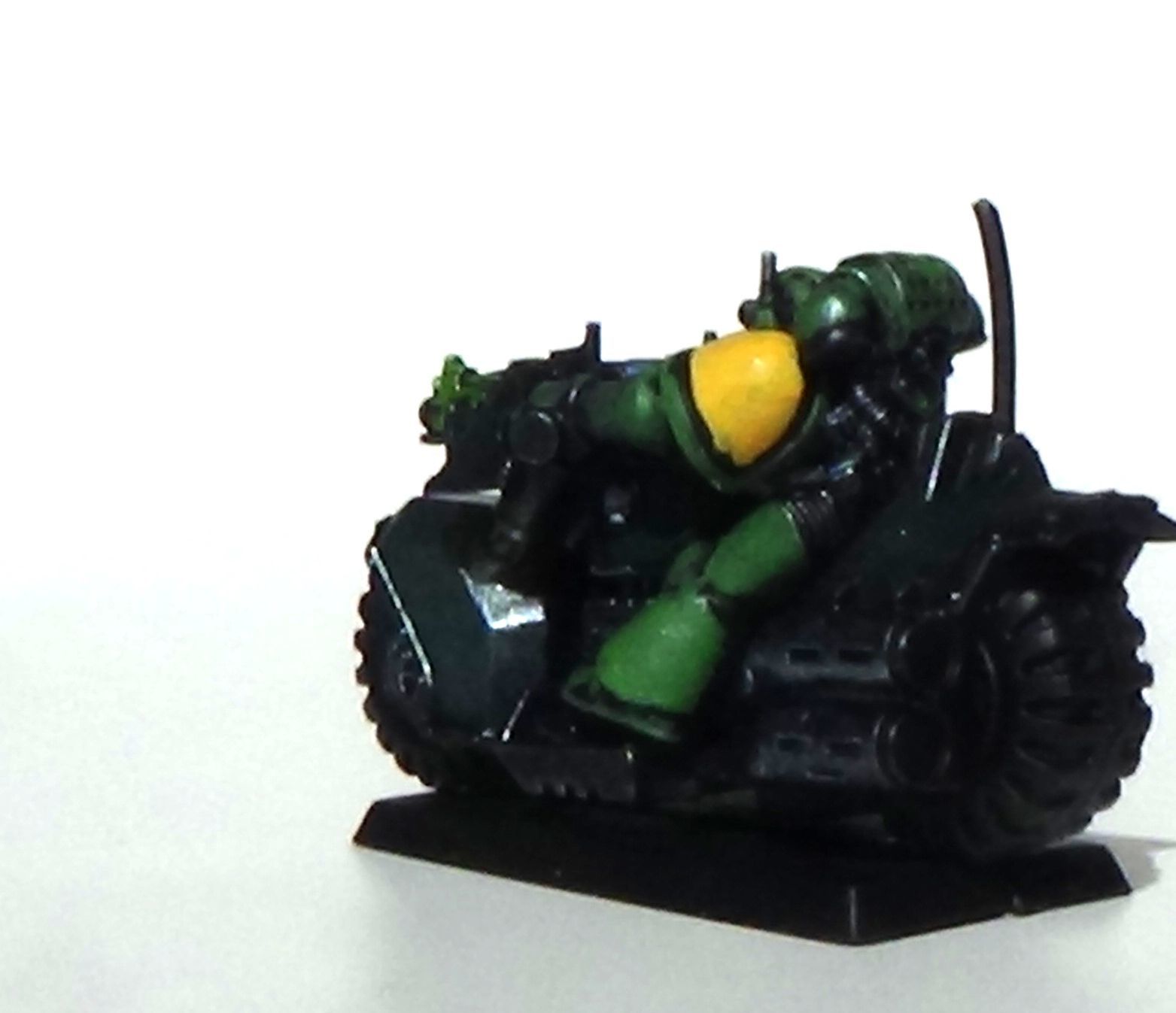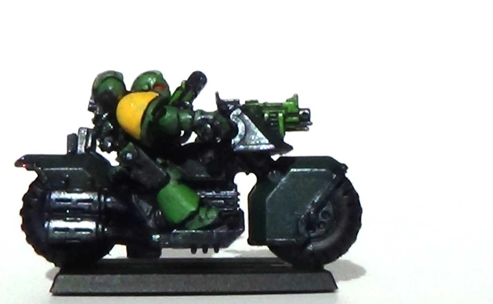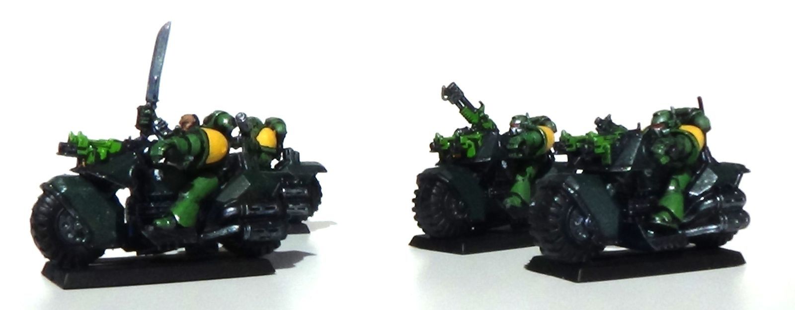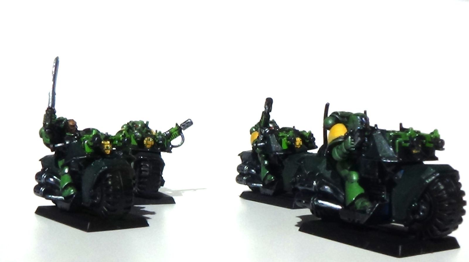 Après plusieurs heures par motos, celles-ci peuvent être peintes. Les corps des spaces marines ont été refaits avec des torses en suppléments. Les bras existants ont été remplacés lorsqu’il a fallu les couper ou recollé si ils étaient dans un état correct. Il y a encore pleins de défauts. Mais ceux ci sont moins visibles. Entre le mastic qui permet de boucher et les nouvelles pièces remises en place, c’est un gros travail qui me permet de jouer des figurines correctes.