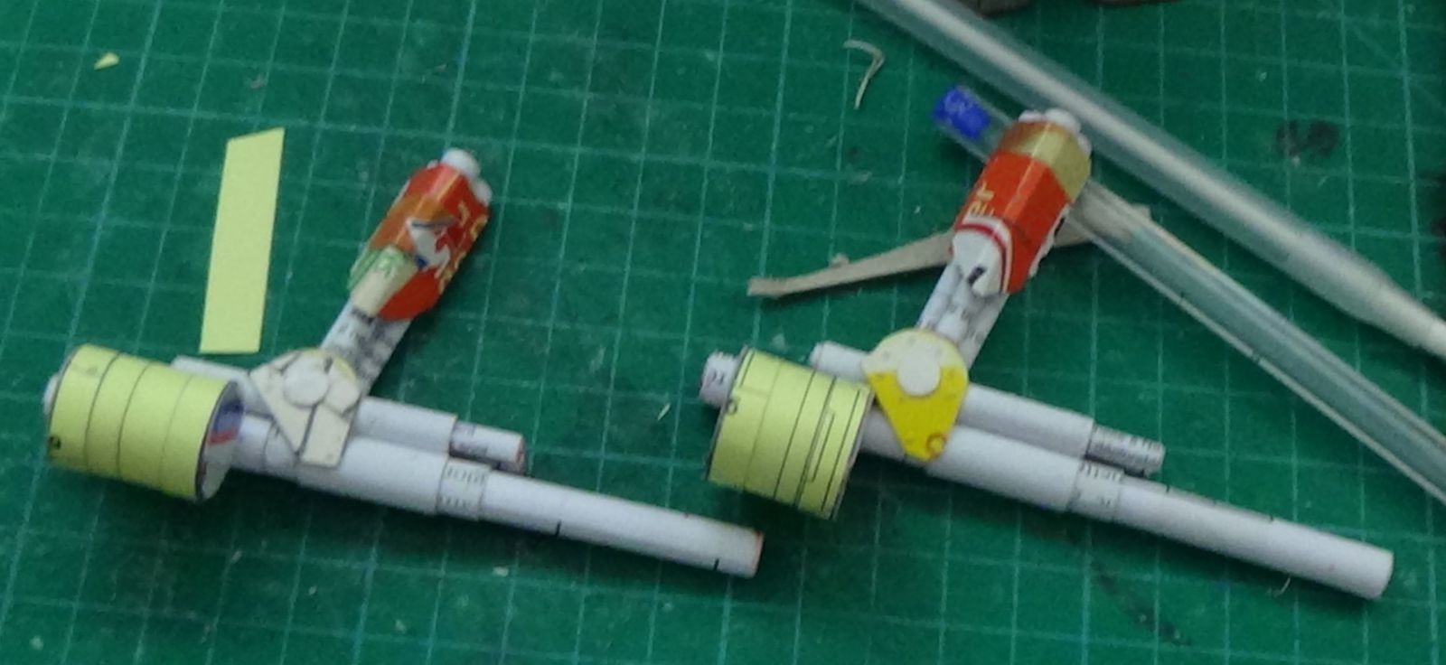 Pour les canons Gatling, les munitions sont beaucoup plus petites. Mais la cadence de tir est considérablement plus importante. De ce fait, les réserves de munitions doivent être beaucoup plus grosses. Si le recul sera plus continu et plus facile à gérer qu’avec un obusier, le poids et les efforts liés aux munitions seront considérables. De ce fait, j’ai imaginé la taille de munitions pour le Gatling et multiplié la longueur du “baril” par deux. Une telle longueur peut surprendre, mais la cadence de tir d’un Gatling est tout simplement monstrueuse.
