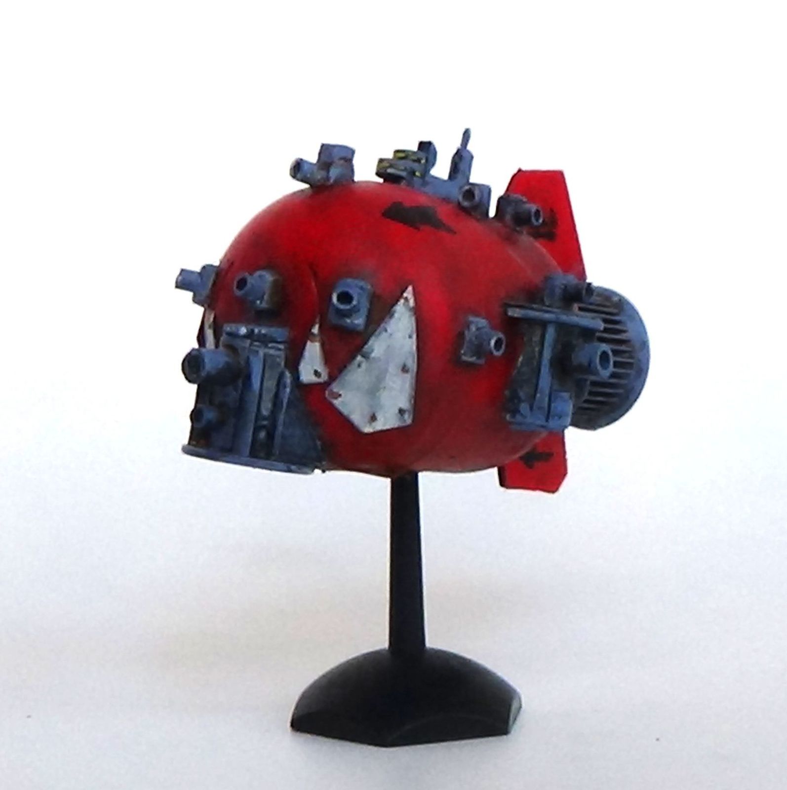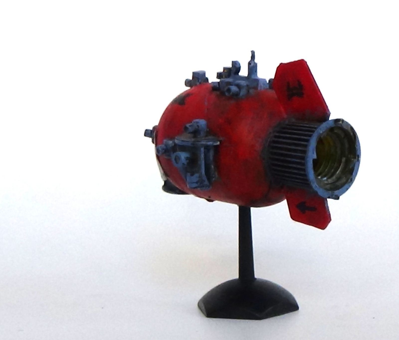 Ceci pour dire qu’il n’existe pas un type, une série, de vaisseaux typiquement ork, mais de nombreux vaisseaux ayant plus ou moins la même fonction. Il est donc logique d’en trouver n’ayant aucune ressemblance entre eux. Ce qui tombe bien: j’ai toujours trouvé raté et laids les vaisseaux orks produits par Games Workshop. J’ai donc décidé de faire les miens en me basant sur quelques points simples : une cohérence d’unité entre les vaisseaux de différents types. Utiliser des bases faciles à trouver … et les peindre en rouge !