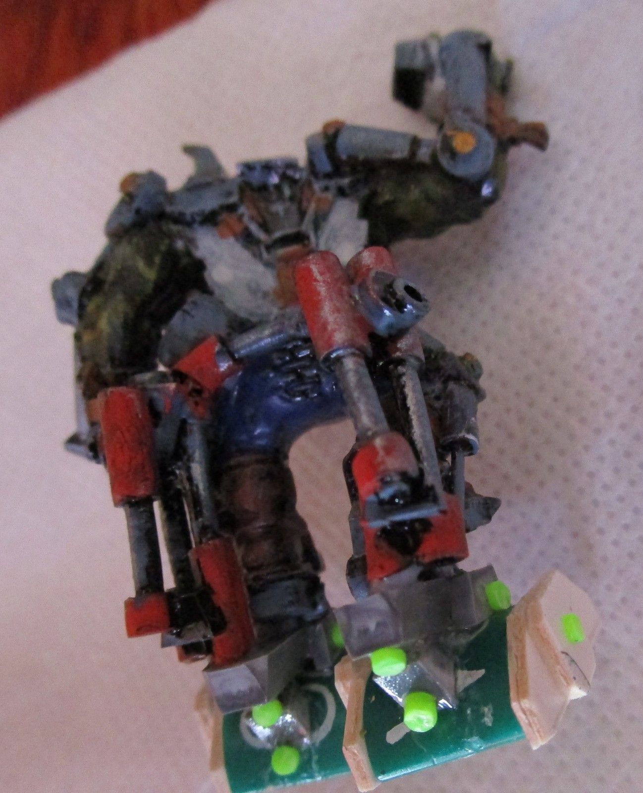 En fait … pas tout à fait. J’ai fait de nombreux essais d’assemblage sans collage avant … de rajouter des vérins partout pour donner un aspect beaucoup plus massif à ma figurine. Comme les vérins prennent de la place, mon assemblage implique de revoir de nombreux détails. Toutefois, une fois une collection de juron qui a eu le mérite de faire mourir de rire mes garçons… il a fallu quelques coups de cutter, de lime et un peu de peinture pour y remédier. Comme quoi, tout le monde, moi le premier, fait des erreurs !